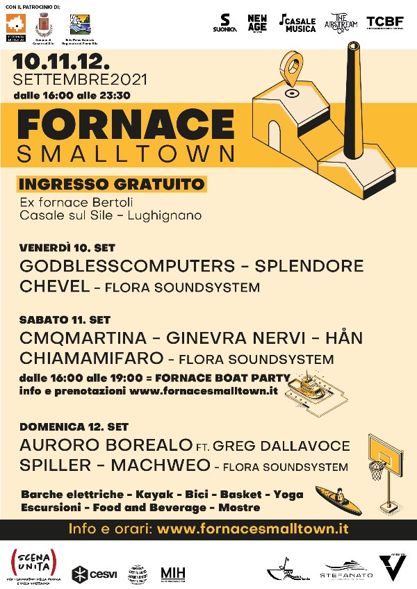 Fornace Smalltown è supportata da Scena Unita, La Musica che Gira e Music Innovation Hub e realizzata con il patrocinio della Provincia di Treviso, del Comune di Casale sul Sile e dell’Ente Parco Naturale Regionale del Fiume Sile.