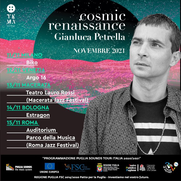 GIANLUCA PETRELLA “Cosmic Renaissance” annuncia le date del tour. L’artista è uno tra i musicisti italiani più riconosciuti al mondo e suonerà per cinque imperdibili appuntamenti: 11/11 Milano al Biko, 12/11 a Venezia all’Argo 16, 13/11 a Macerata presso il Teatro Lauro Rossi (Macerata Jazz Festival), 14/11 a Bologna all’Estragon e chiude il 15/11 a Roma presso l’Auditorium Parco Della Musica (Roma Jazz Festival).