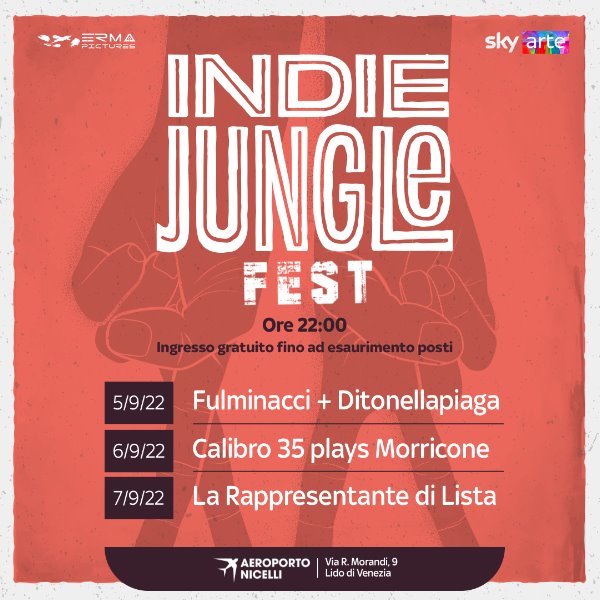 INDIE JUNGLE, il format televisivo dedicato alla musica dal vivo in onda su Sky Arte, sbarca al Lido di Venezia: il 5, 6 e 7 settembre, presso l’Aeroporto Nicelli durante le giornate della 79ª Mostra Internazionale d’Arte Cinematografica di Venezia, è in programma “INDIE JUNGLE FEST”, la serie di concerti esclusivi organizzati da ERMA PICTURES in collaborazione con SKY ARTE e AEROPORTO NICELLI per presentare la nuova stagione di “INDIE JUNGLE”.