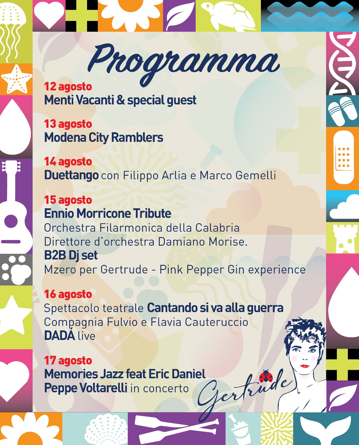 Il 16 agosto sul palco di Gertrude sarà la volta dello spettacolo teatrale “Cantando si va alla Guerra” con Fulvio Cauteruccio, Flavia Pezzo e Peppe Voltarelli e a seguire DADA’ live, mentre per il 17 agosto si esibiranno due band: Memories Jazz con il grande sassofonista Eric Daniel ed a seguire Peppe Voltarelli con il suo ultimo Album “La grande corsa verso Lupionópolis”.