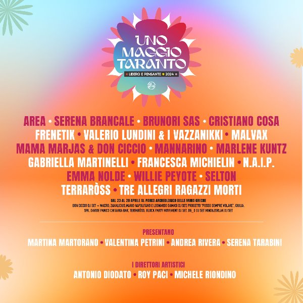 “In un momento buio come quello che stiamo vivendo, Uno Maggio Taranto vuole essere più che mai un grido di resistenza, presenza civica, vicinanza ai movimenti che lottano ogni giorno – dichiarano i direttori artistici Antonio Diodato, Roy Paci e Michele Riondino. Una manifestazione organizzata dal basso, da lavoratori, cittadini, esseri umani che credono nel confronto, nell’incontro, nell’importanza di ritrovarsi e riconoscersi in un giorno di festa che, ormai molto spesso e da molto tempo, sembra aver perso una reale connessione con la realtà. Crediamo fortemente nel potere che la musica ha di amplificare messaggi e conoscenza. Perciò grazie ancora una volta agli artisti, ai movimenti, a tutte le realtà che hanno deciso di essere con noi anche quest’anno”.