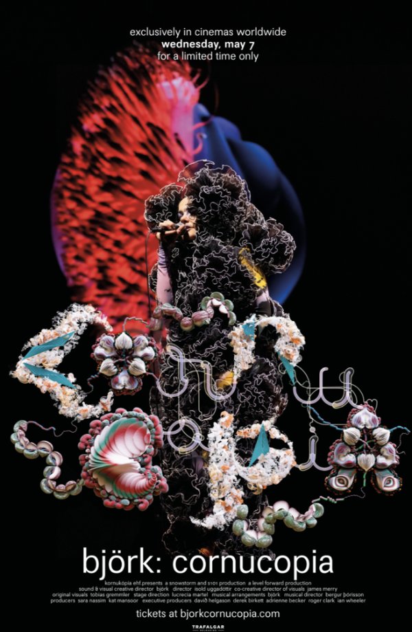 Il film – della durata di 1 ora e 39 minuti più una proiezione aggiuntiva di 3 video musicali – è la performance live più elaborata di Björk ad oggi e sarà disponibile in circa 500 cinema in oltre 25 paesi a partire dal 7 maggio, tra cui Australia, Brasile, Canada, Danimarca, Francia, Germania, Spagna, Svizzera, Svezia, Stati Uniti, Regno Unito ed altri ancora. ‘Björk: Cornucopia’ offre una rara opportunità di vivere la piena magia dello spettacolo originale in uno straordinario 4K e Dolby Atmos in un ambiente cinematografico, rendendolo un evento imperdibile. I biglietti sono in vendita dal 27 marzo al sito bjorkcornucopia.com.